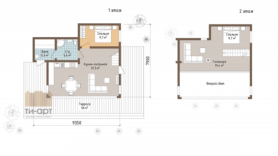 Планировка дома предполагает воздушность, лёгкость и простор для небольшой семьи. Главная деталь - второй свет, стирающий границы двух этажей. Подобный приём наполняет дом дневным светом, что особенно важно в зимний период, когда день становится коротким и не хочется упустить ни секунды солнца. А в период рассвета и заката дом будет освещаться уникальными красками.