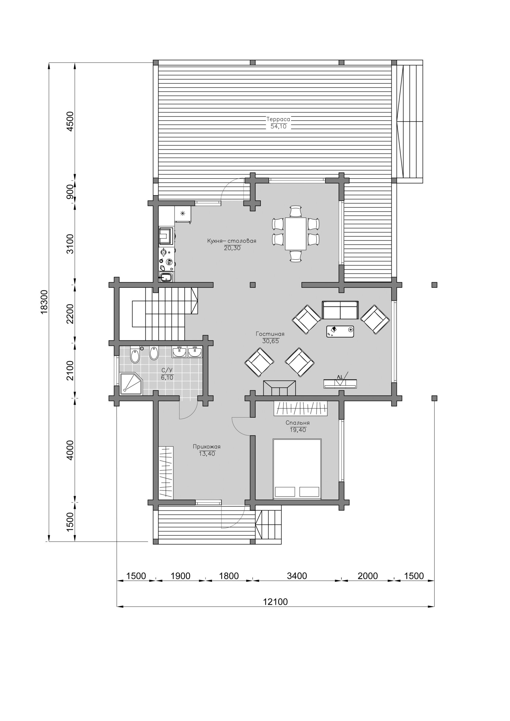 Дом однозначно подойдет для любителей загородной жизни и всего, что ей сопутствует: как вам терраса площадью более 50 кв.м? Пробуждает желание позвать друзей на гриль, правда? Через террасу можно попасть в кухню-столовую и дальше расположиться в просторной гостиной. На первом этаже также есть спальня, а на втором этаже их еще три. Плоская кровля подчеркивает геометрию дома в каждой детали: от формы клееного бруса до обрамляющих фасад балконов.